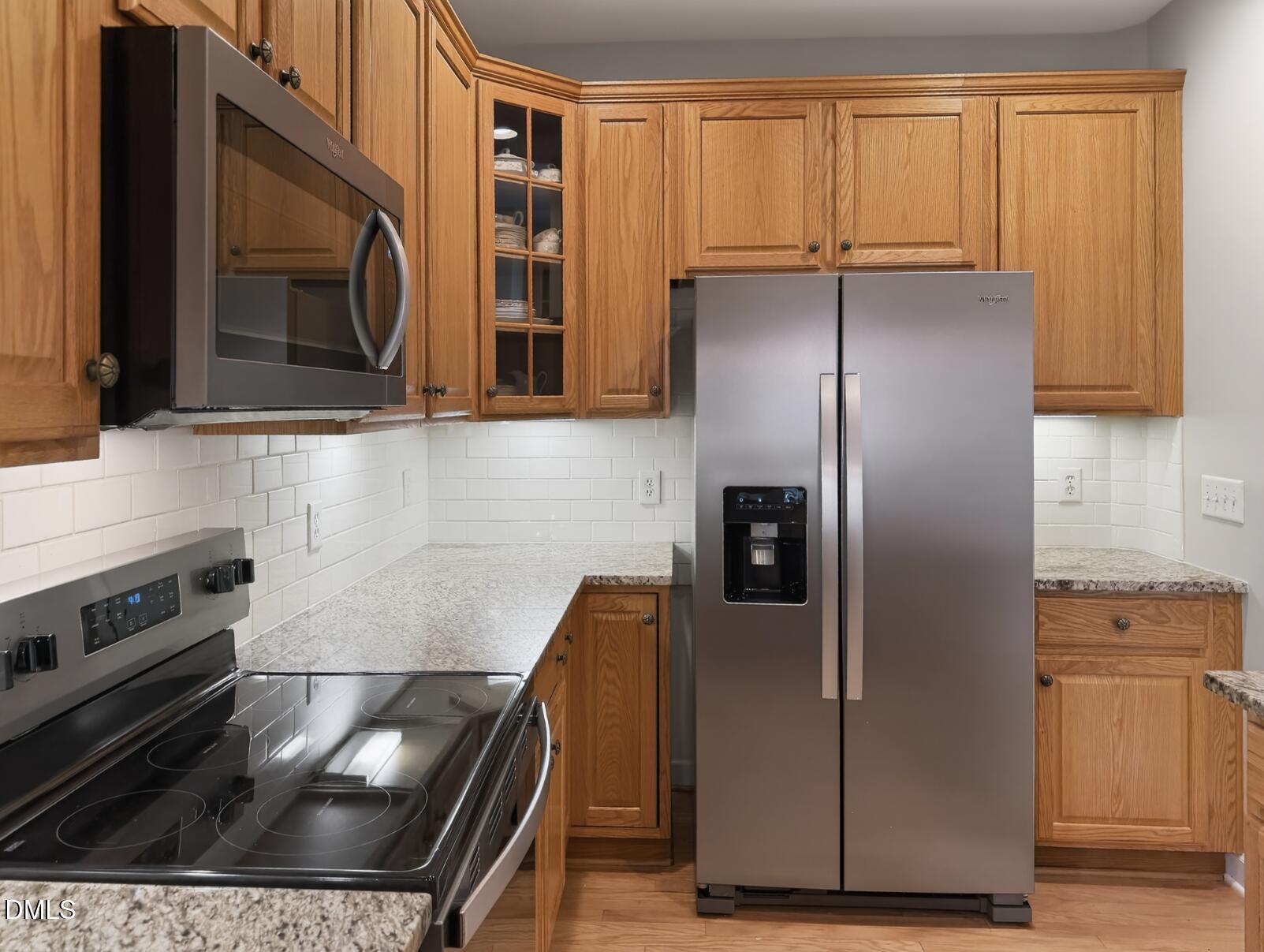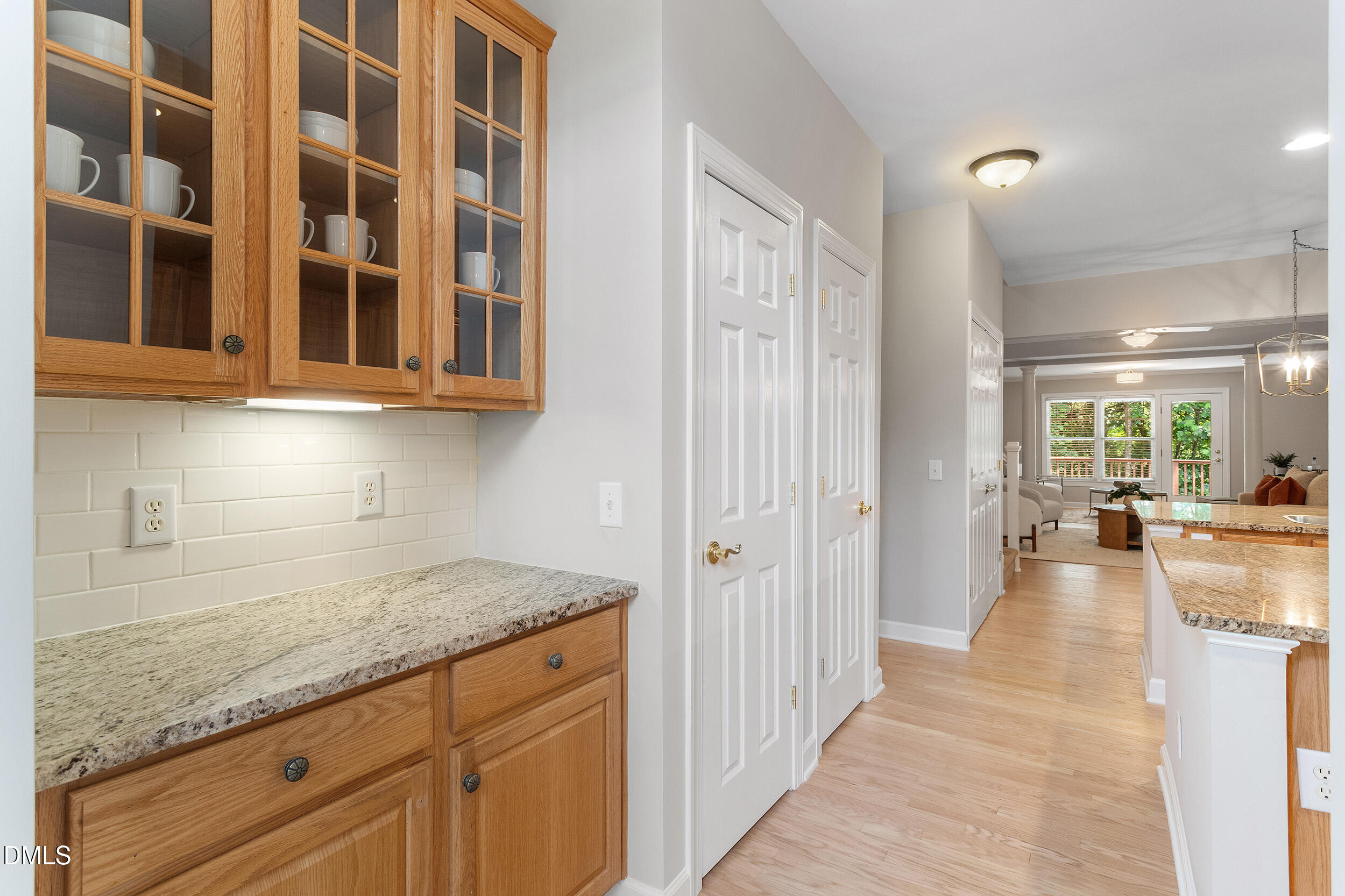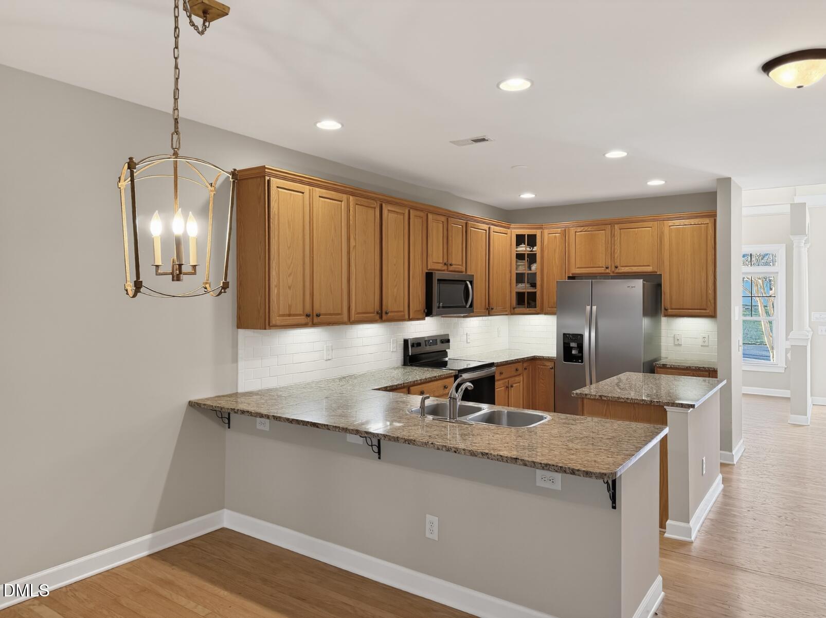 Upon entry, you're greeted by exquisite architectural details and newly refinished white oak hardwood floors. An open kitchen stands as a masterpiece with rich raised-panel oak cabinetry, elegant glass display fronts, gleaming granite countertops, and a stylish subway tile backsplash. Brand new Stainless Steel appliances! A center island and breakfast bar peninsula, generous pantry, rollout drawers, under-cabinet lighting, and a butler's pantry with display cabinetry set the stage for culinary excellence and effortless entertaining.