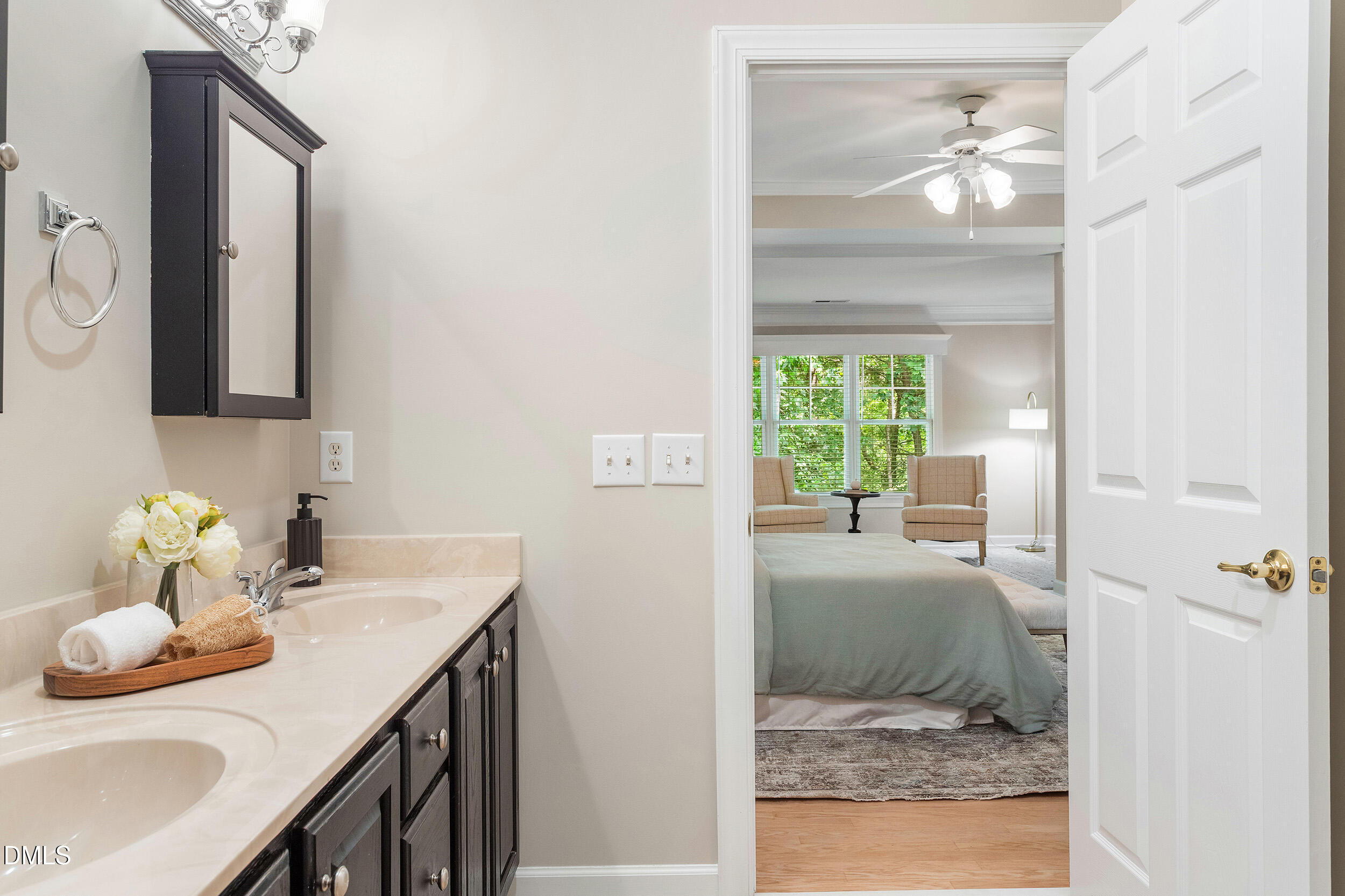 Retreat to a first floor owner's suite, a sanctuary of sophistication with tray ceilings, crown molding, dual closets, and a tranquil sitting area. The ensuite bath, offers dual vanities, tasteful makeup lighting, and a spacious walk-in shower with accessible appointments for easy self-care.