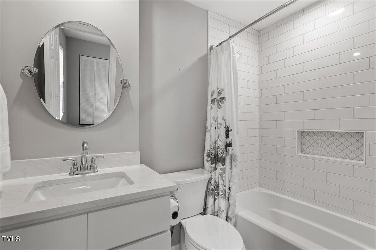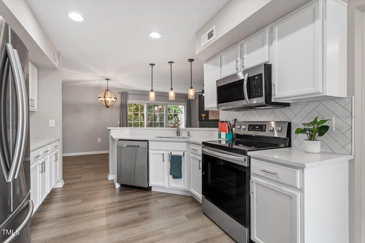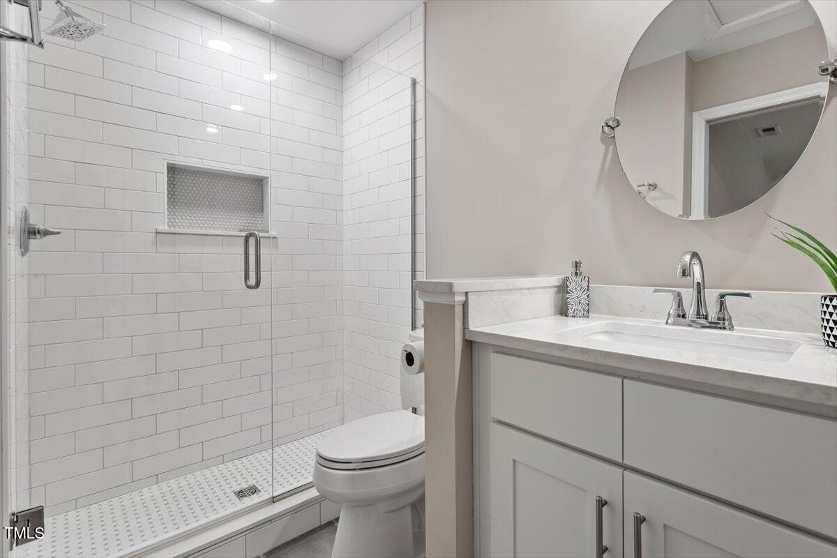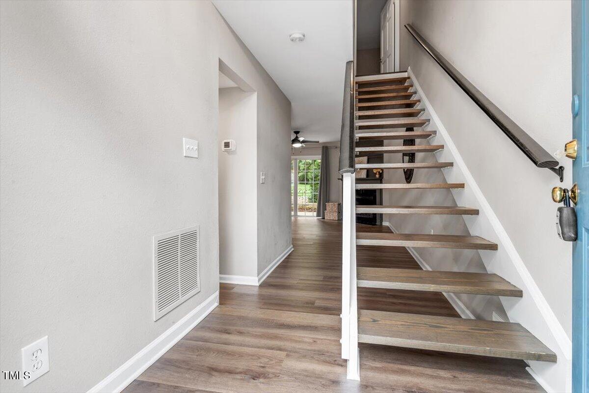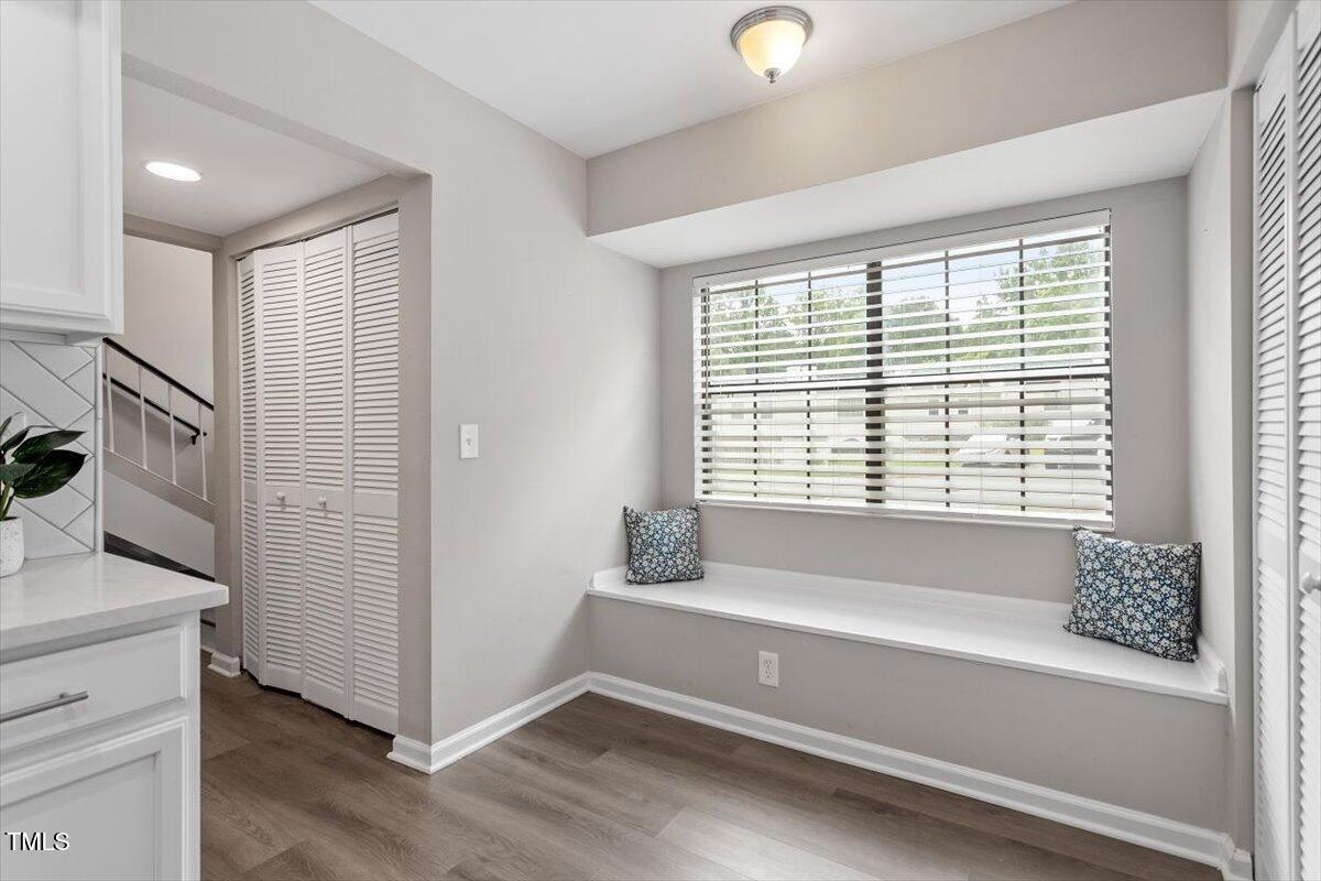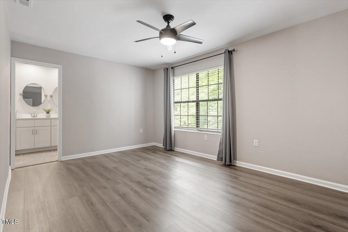 Beautiful End-Unit Condo in Prime North Raleigh Location! Live the maintenance free life-style in the desirable Cottages of Stonehenge. Features 2 spacious bedrooms, each with its own updated ensuite bath, plus a renovated powder room. LVP flooring throughout (NO carpet!). The kitchen features quartz countertops, glass tile backsplash, stainless steel appliances and tons of cabinet space. The over-sized sliding glass door brings in plenty of natural light. The owner's bathroom has a large walk-in shower and dual sinks. Enjoy one of the largest backyard spaces in the neighborhood that backs up to wooded area and has extra patio space plus functional fencing. Water heater (2020) and new AC (2025)! The Storage room is in the back of the condo. Community amenities include pool, tennis courts, clubhouse, and playground perfect for Summer activities. Top-rated schools and unbeatable location close to shopping, dining, and major roads. Great for investors who are looking for Raleigh rentals. Assigned parking in front plus visitor spaces. A must-see!